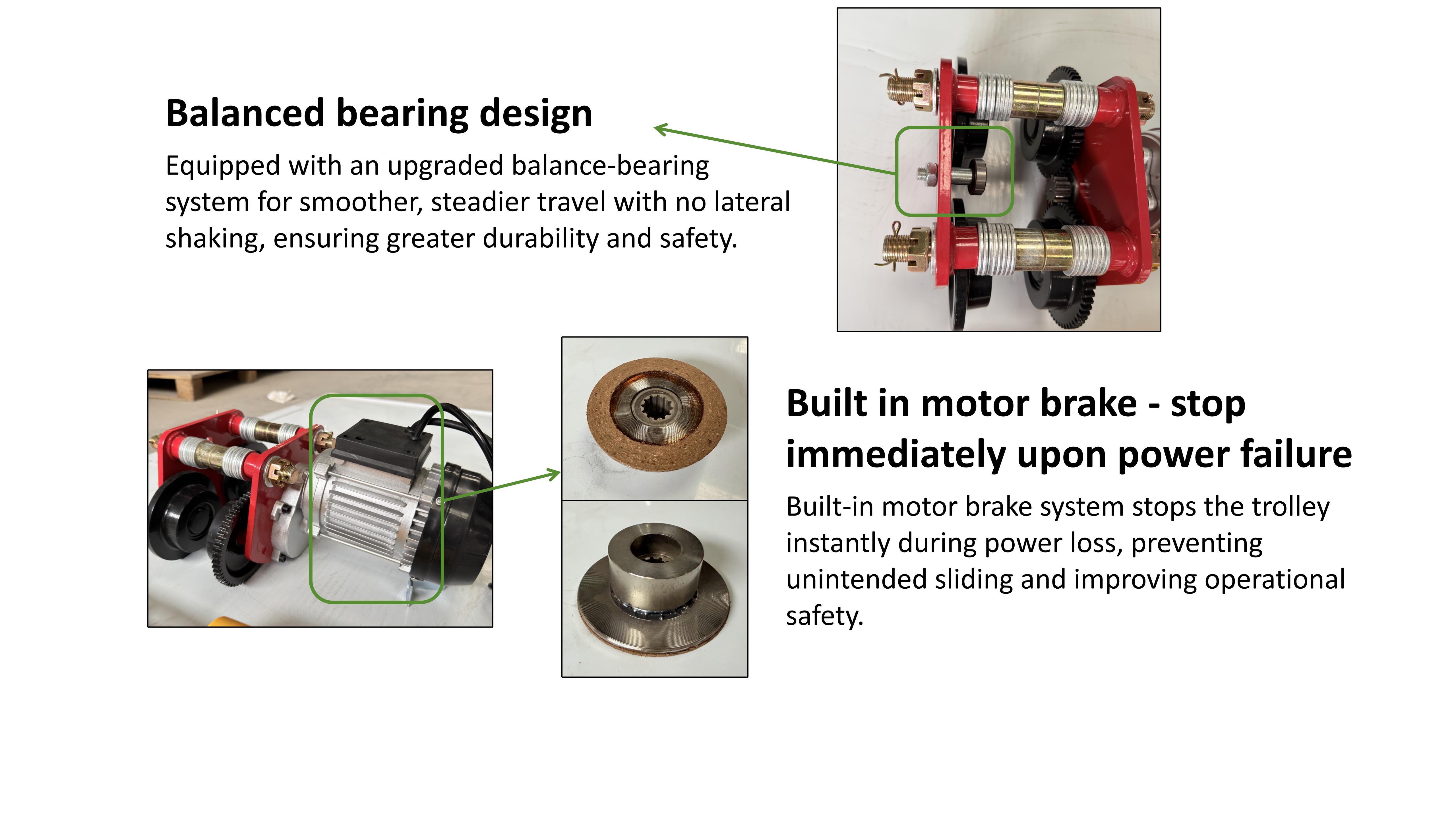 Instant braking when power is cut, prevents sliding and ensures safety during overhead lifting.